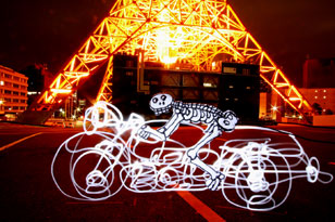 レンズの前10cmにライダーをくくりつけ カメラ前方3mくらいの位置で懐中電灯で一筆描きです。東京タワ11時30分に駐車場のライトが消える。終電を気にしながらの10分が勝負です。