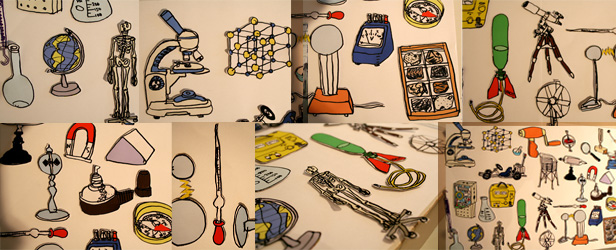 100円ショップのスケッチブックはちょっとソフトで使いやすいです。B3の鉛筆でごりごり描いて フォトショップで色を入れて。こいつを 0.3mmの鉛の板に張り付けてハサミで切り出します。鉛がちょっと毒っぽいとゆうところが良いですね。理科実験器具メーカーの仕事でした。